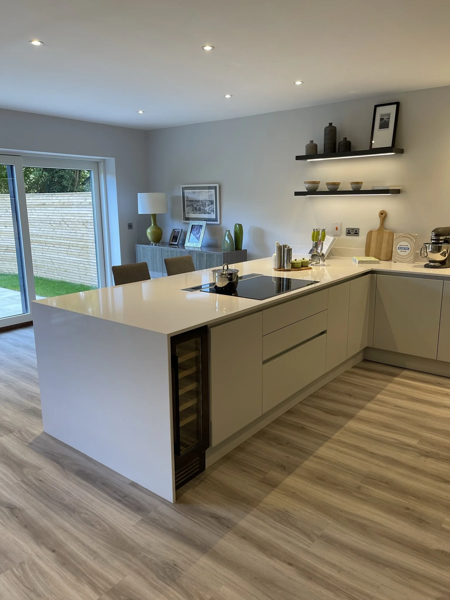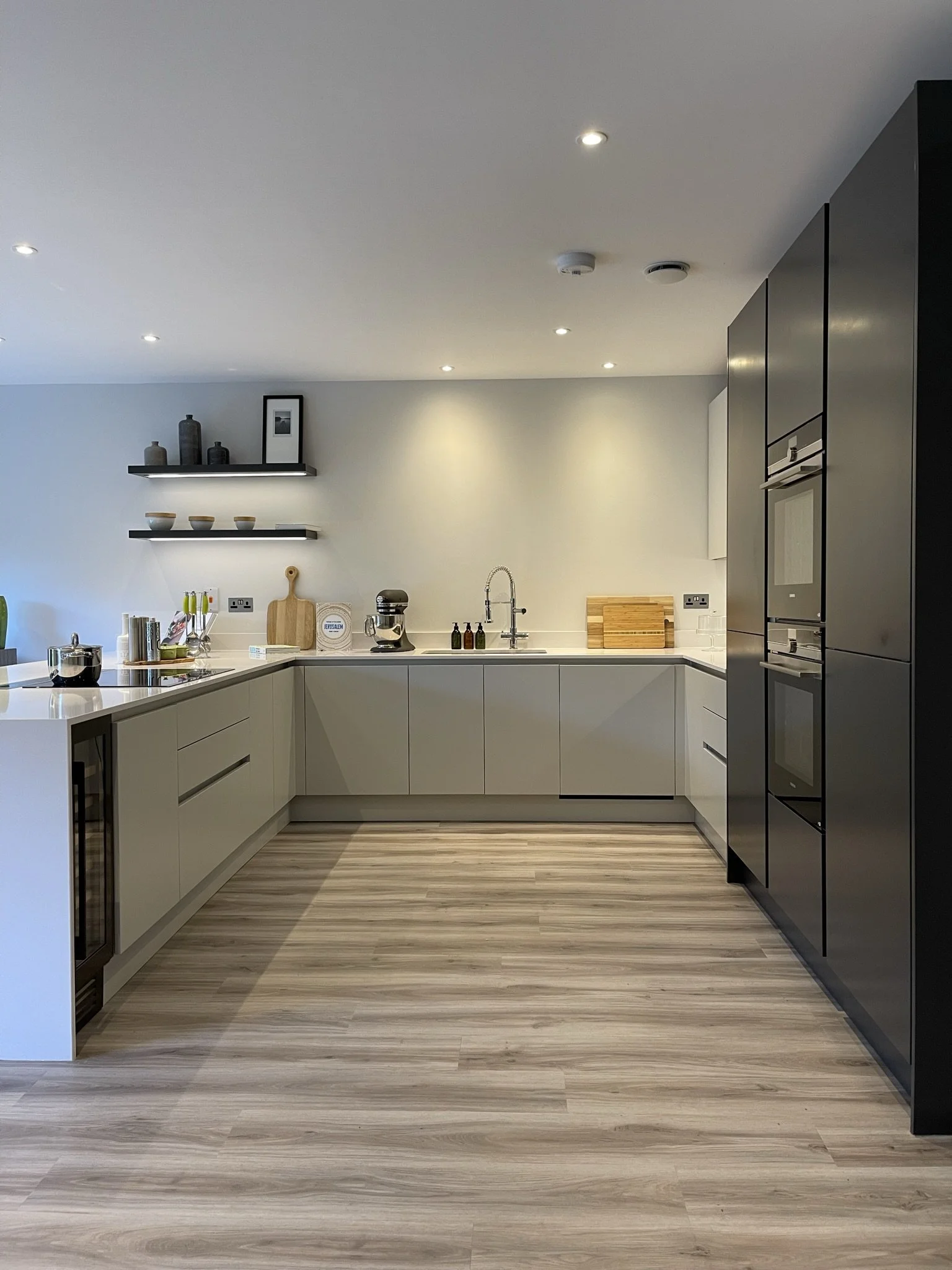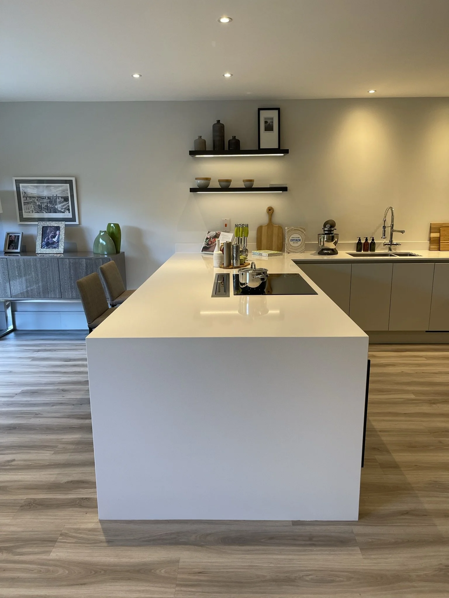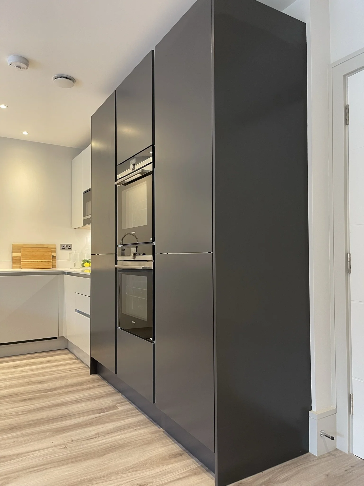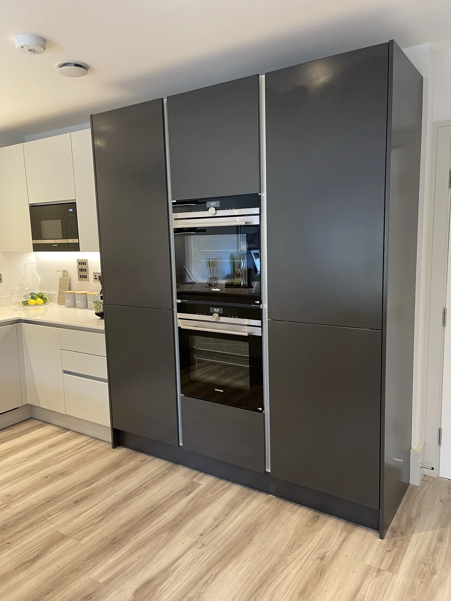 Product: Matte Graphite and Cashmere handless Cabinetry, with White Storm Silestone, including mitred downstand on peninsular.