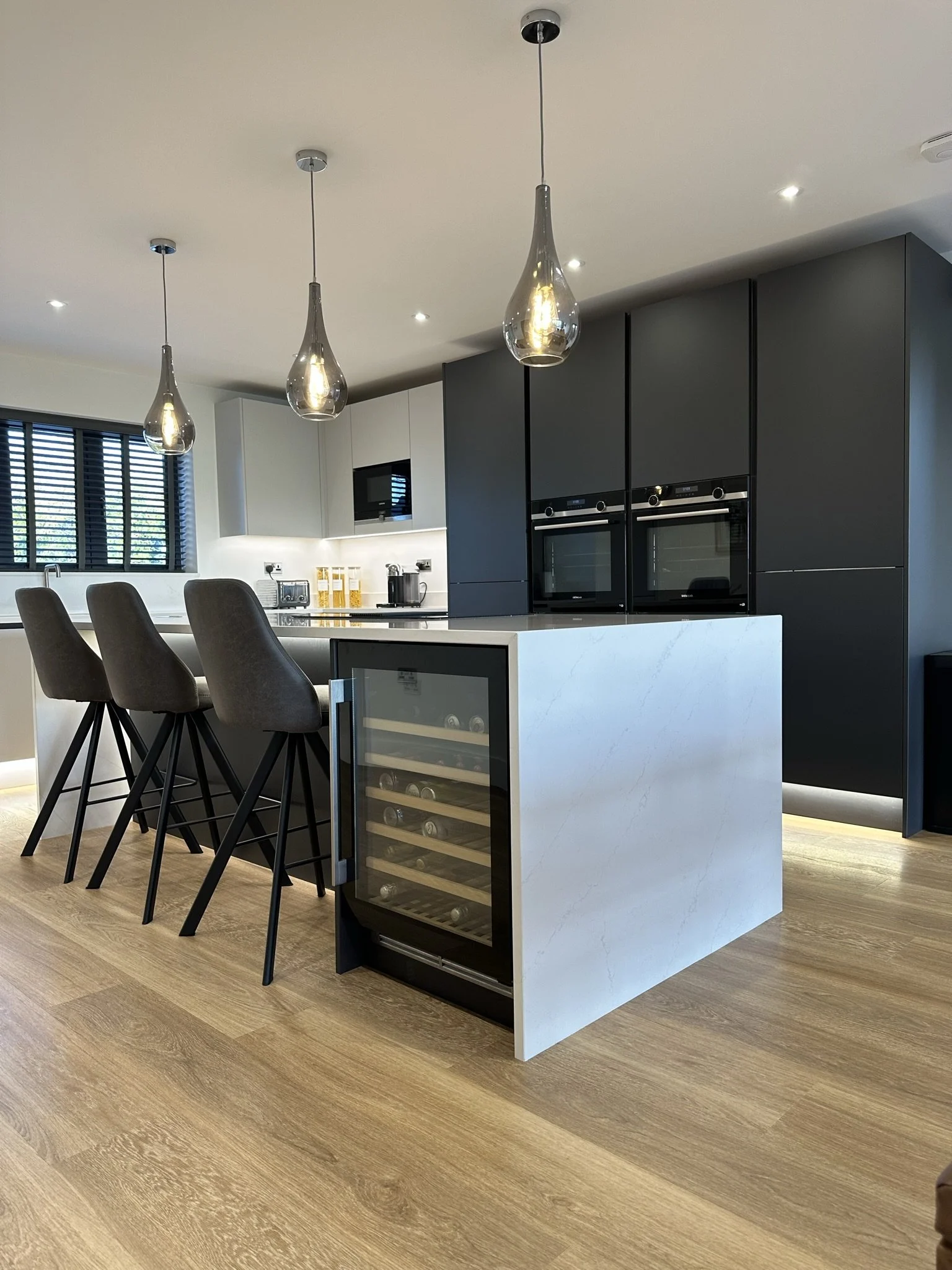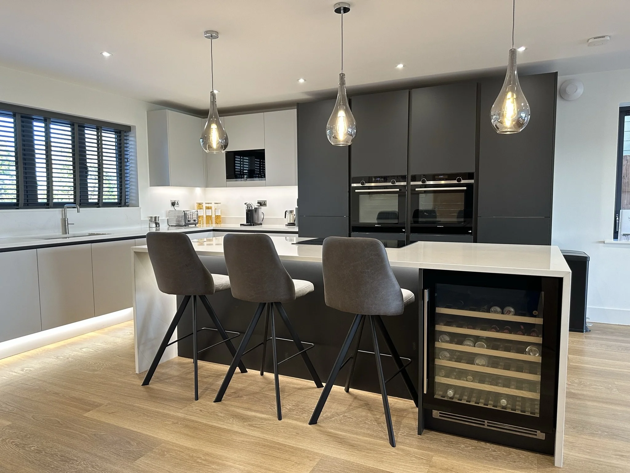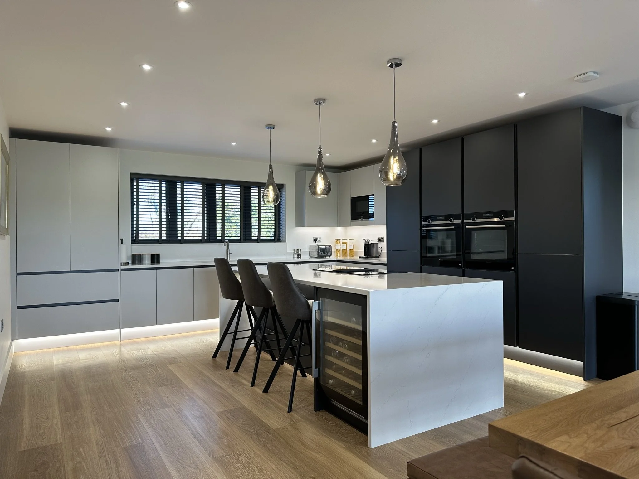 Product: Mornington Beaded Shaker Cabinetry, in Dove Grey and Graphite Cabinetry, complimented by Miami Vena silestone worksurface. 30mm with downstands on the island. Bi-fold doors and internal warm LED lighting within the shelving