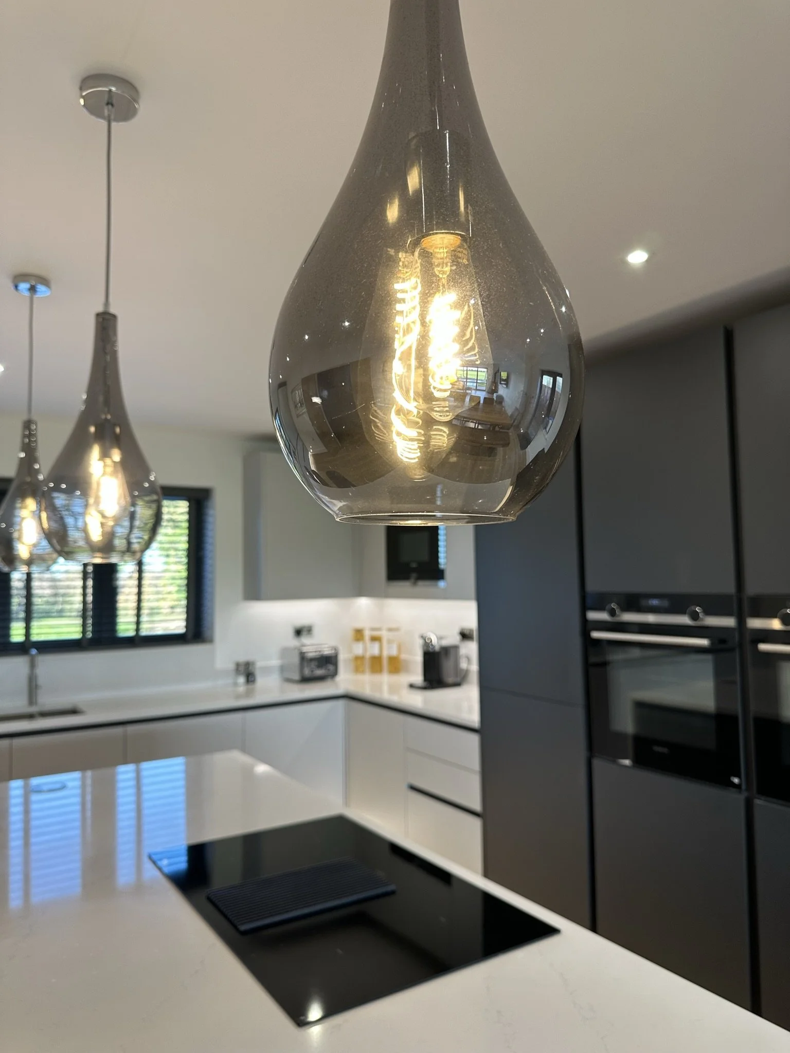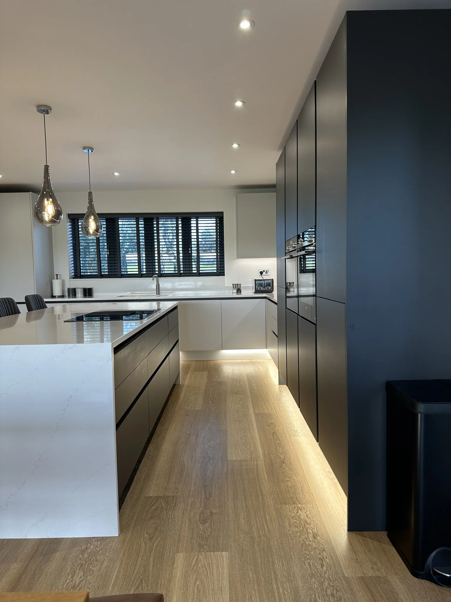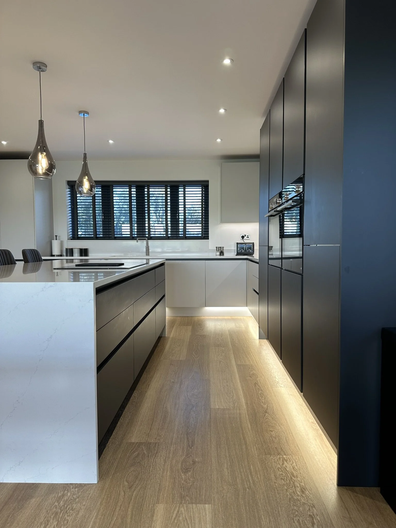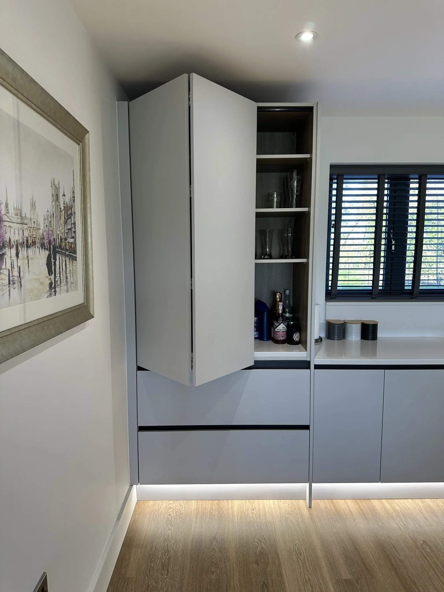 Product: Mornington Beaded Shaker Cabinetry, in Dove Grey and Graphite Cabinetry, complimented by Miami Vena silestone worksurface. 30mm with downstands on the island. Bi-fold doors and internal warm LED lighting within the shelving