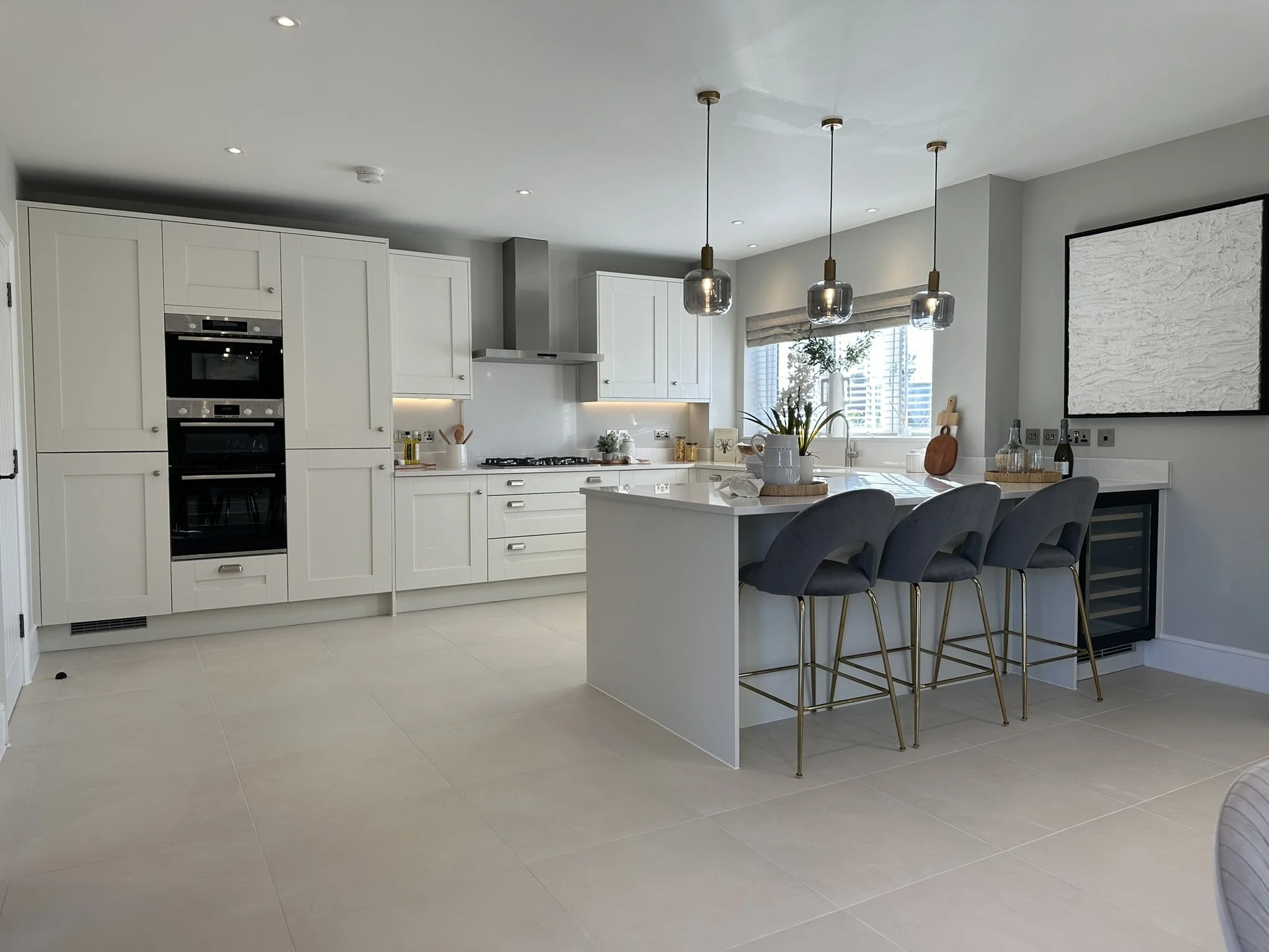 Development size? This Show Home kitchen was part of the diamond specification offered by our clients to potential buyers. A spacious room, enabling open plan family living with the dining area. The breakfast bar keeps the room a social hub, as well as an area of cooking preparation.